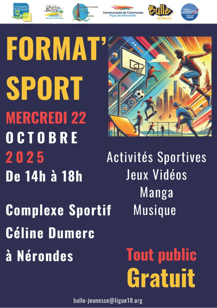 - l’évènement Format Sport, ouvert à tout public et organisé par l’UFOLEP, aura lieu le mercredi 22 octobre au complexe sportif Céline Dumerc à Nérondes.