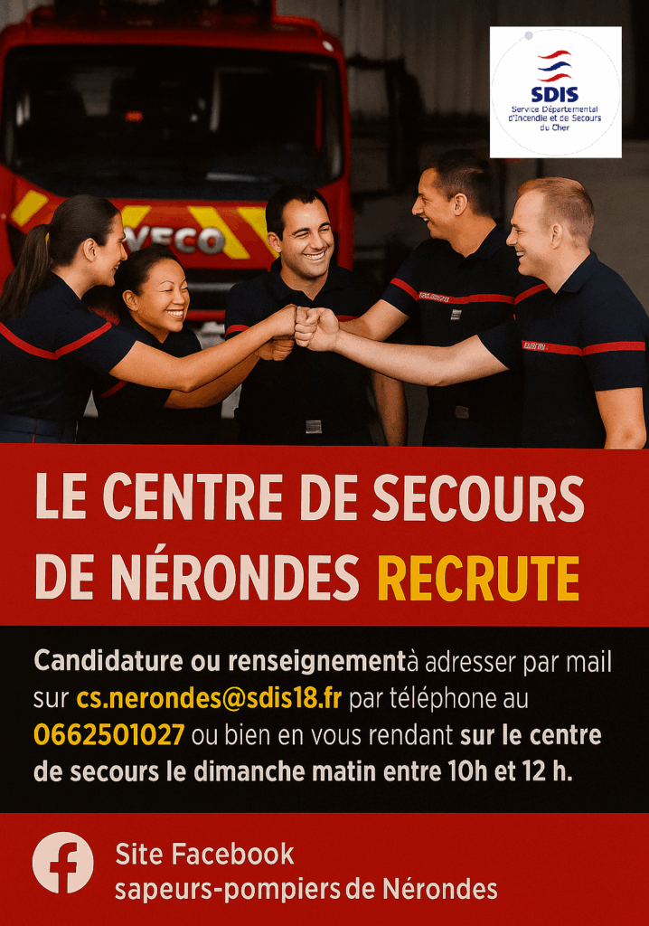 Le centre de secours de Nérondes rencontre aujourd’hui de réelles difficultés à recruter de nouveaux sapeurs-pompiers volontaires, dans un contexte où notre bassin d’emploi se compose majoritairement de personnes éloignées du territoire en journée.