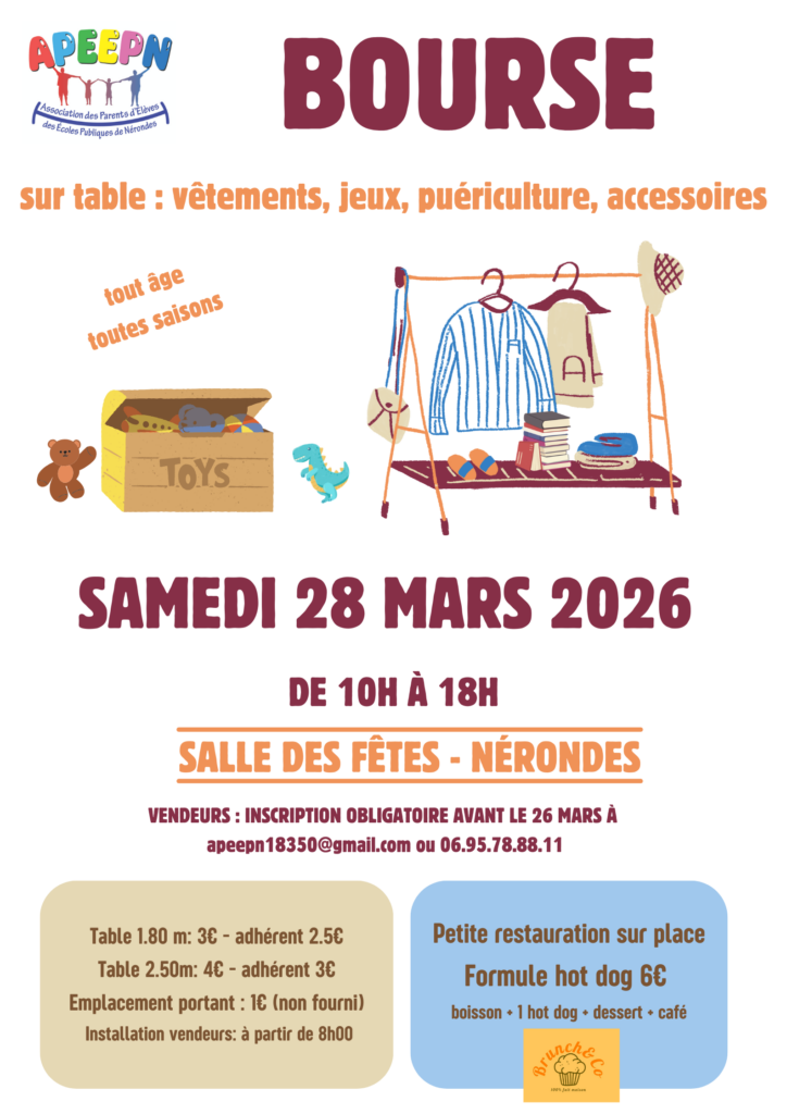 L’association des parents d’Elèves de l’Ecole Publique de Nérondes organise une bourse aux vêtements, jouets, puériculture, accessoire le samedi 28 mars 2026; dont les bénéfices permettront de financer les sorties scolaires des écoles.