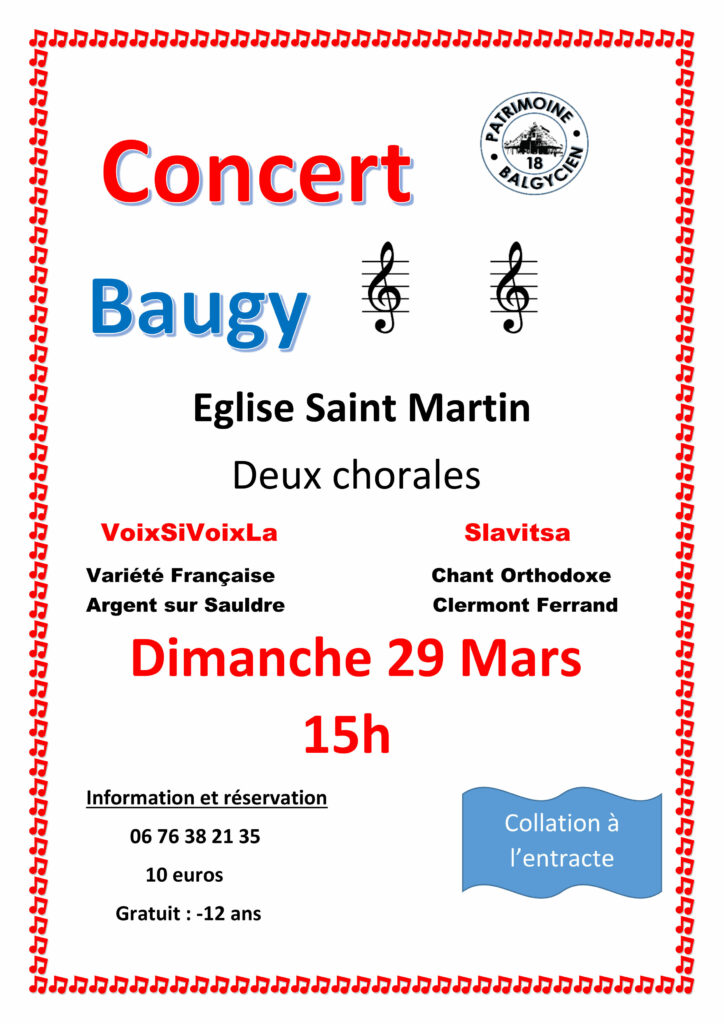Le dimanche 29 mars à 15h, les chorales Voix Si Voix la et Slavitsa se produiront à l’église Saint-Martin . Les réservations sont a faire auprès du président au 06 76 38 21 69.